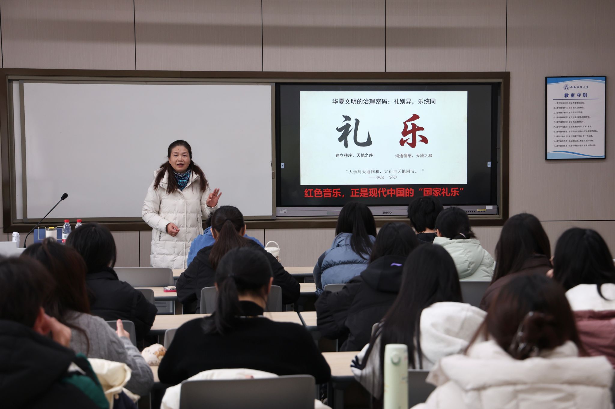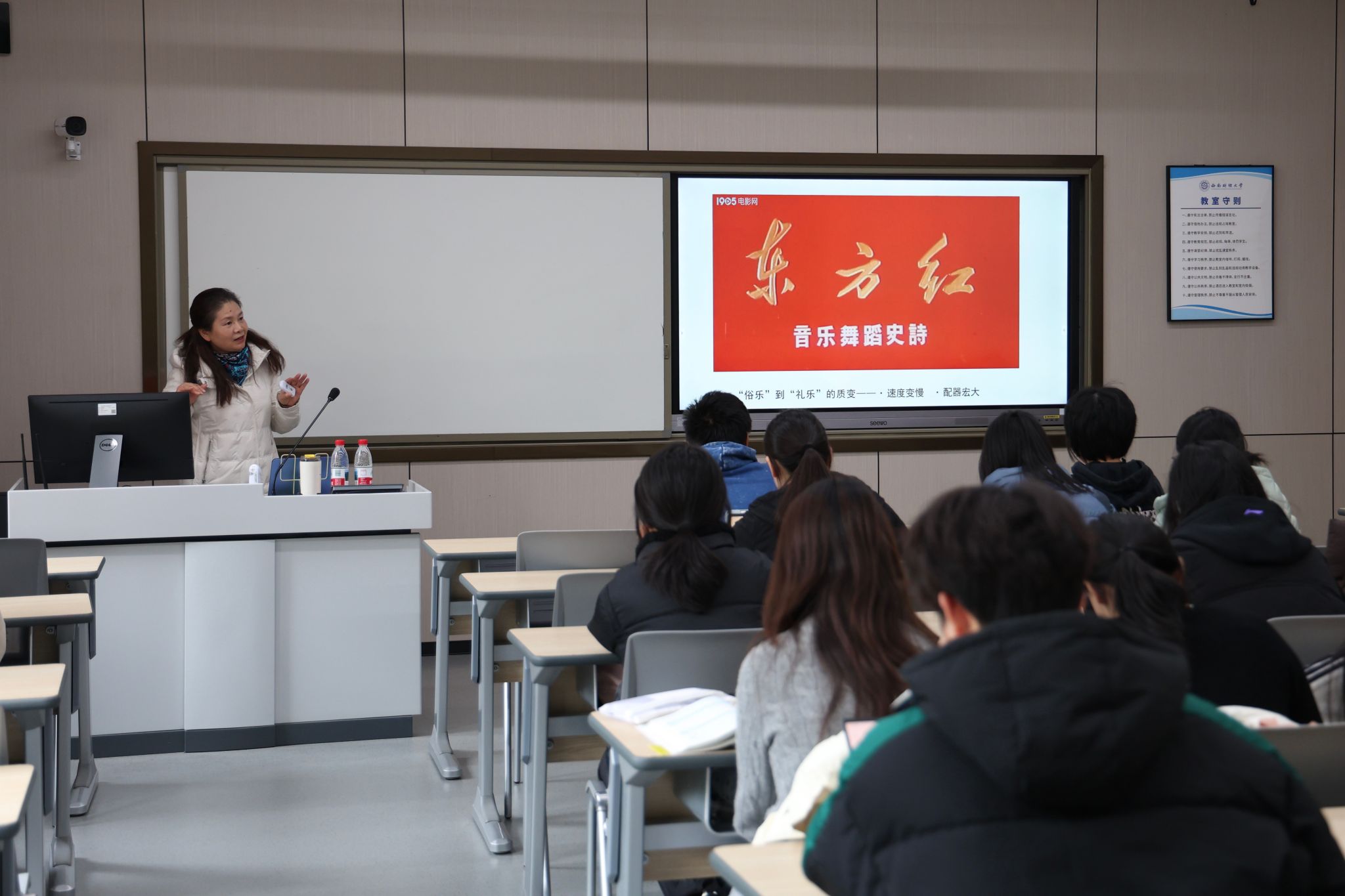 讲座中,魏平结合《东方红》《红旗颂》等经典作品,解析旋律背后的历史记忆与民族气概。通过现场播放、旋律哼唱与结构讲解,引导学生感受红色音乐的艺术力量与精神厚度。